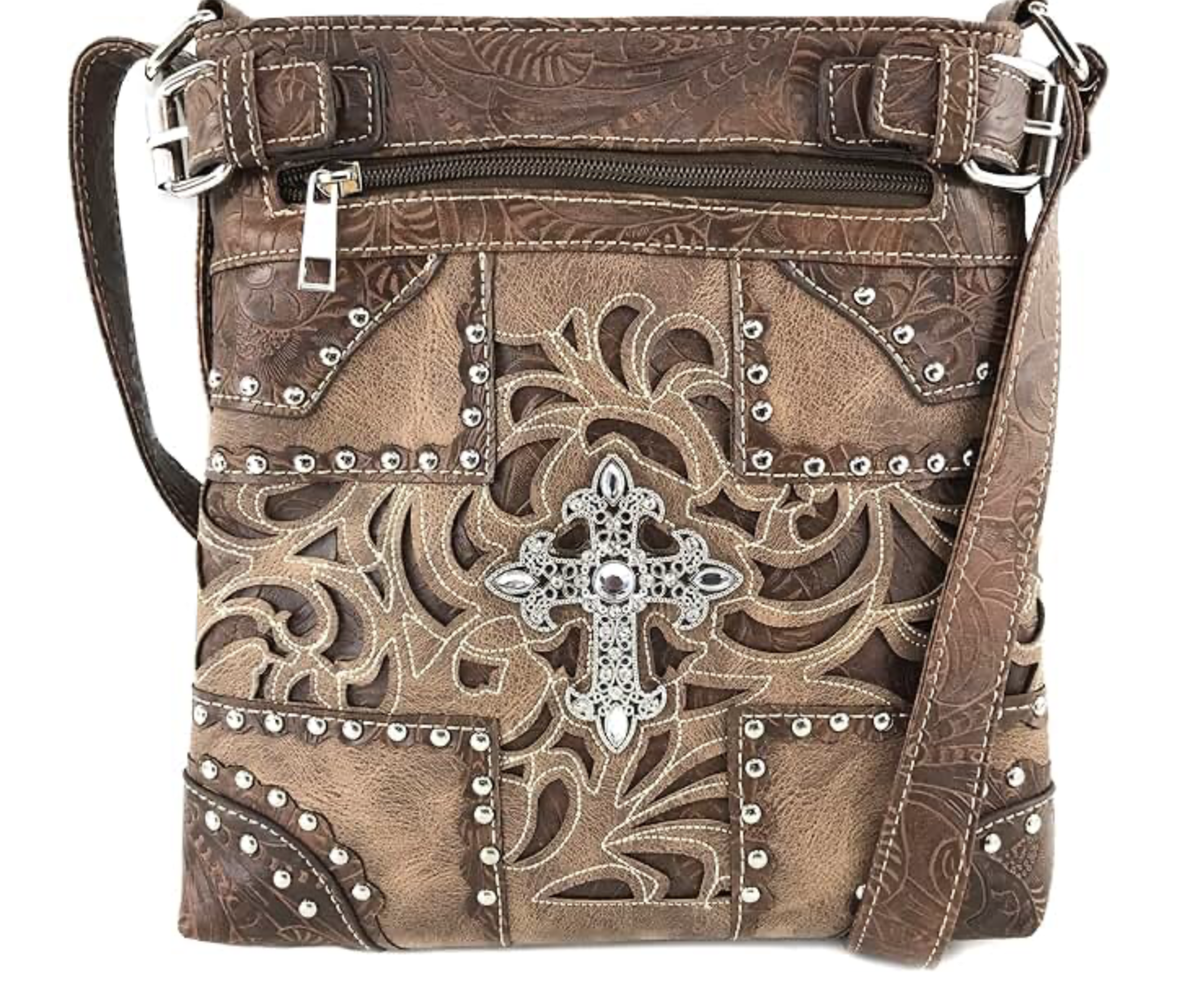 Justin West crafts bold, stylish women's handbags and purses with authentic Western flair and practical concealed carry options. Our collection features floral buckle purses, angel wings cross designs with faith/hope/love motifs, laser-cut rhinestone silver cross messengers, camouflage tree branch bling with rhinestone crosses and wings, and tooled croc faux leather bags accented with silver rhinestones. Each bag includes secure concealed carry compartments, durable faux leather or vegan materials, adjustable straps, multiple pockets, and eye-catching embellishments—perfect for everyday carry, church, rodeo events, or country concerts. Designed for women who love Western, faith-inspired, and blinged-out style with functional safety features, Justin West offers quality, attitude, and value, backed by a 1-year warranty and 30-day returns.